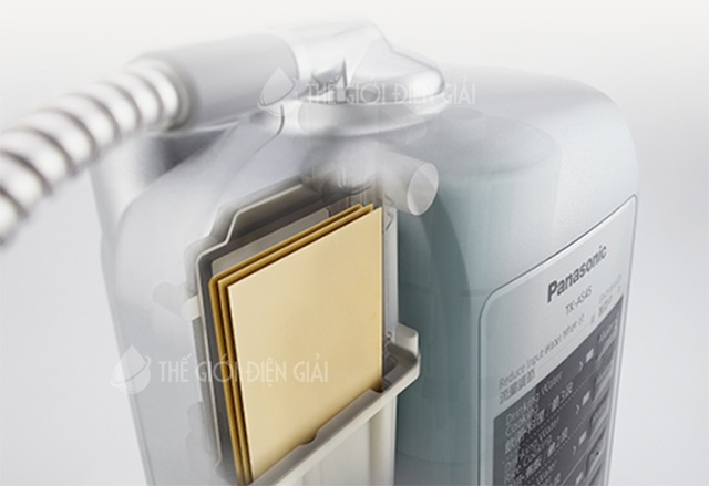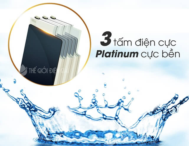 Còn buồng điện phân (buồng điện giải) gồm: 3 tấm điện cực nguyên khối xếp xen kẽ. Các tấm điệncực từ nguyên liệu quý và đắt tiền: titan phủ platinum với độ bền cao, giảm tình trạng canxi bám lên điện cực, đảm bảo hiệu suất điện phân, tạo nước ion kiềm tốt nhất.
