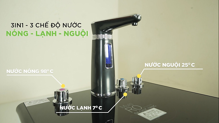 Với hệ thống 1 vòi 3 chế độ Nóng - Lạnh - Nguội đáp ứng mọi nhu cầu sử dụng. Chất lượng nguồn nước tinh khiết đạt chuẩn quốc gia QCVN 6-1: 2010/BYT QUY CHUẨN NƯỚC UỐNG TRỰC TIẾP