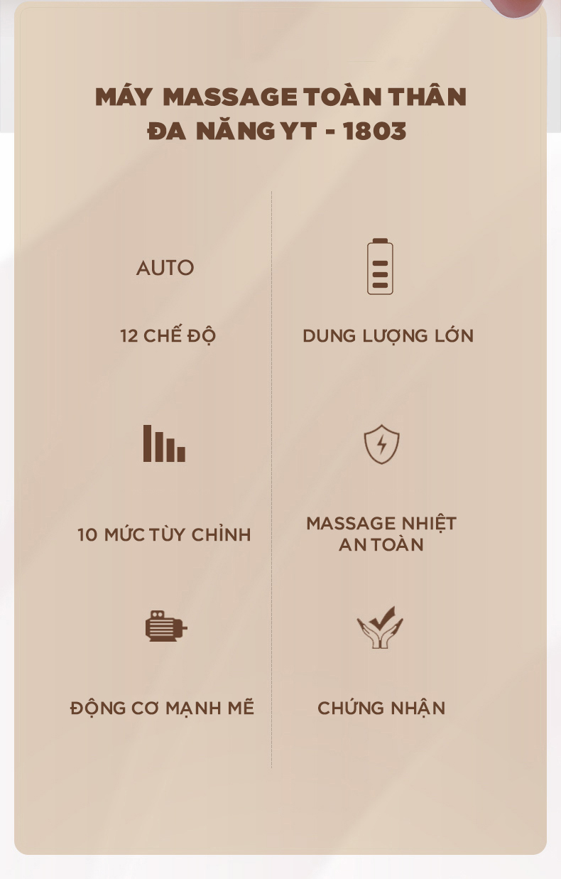 - 10 TỐC ĐỘ ĐIỀU CHỈNH & 12 CHẾ ĐỘ MASSAGE: Dù bạn thích trải nghiệm massage với cường độ nhẹ nhàng hay mạnh, chỉ cần nhấn nút chọn chế độ, máy sẽ đáp ứng nhu cầu của bạn.