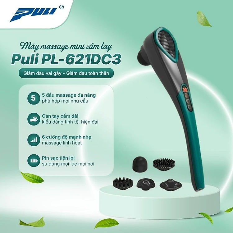Máy massage cầm tay cán tay dài pin sạc Puli PL-621DC3 - 5 chế độ, 5 đầu mát xa