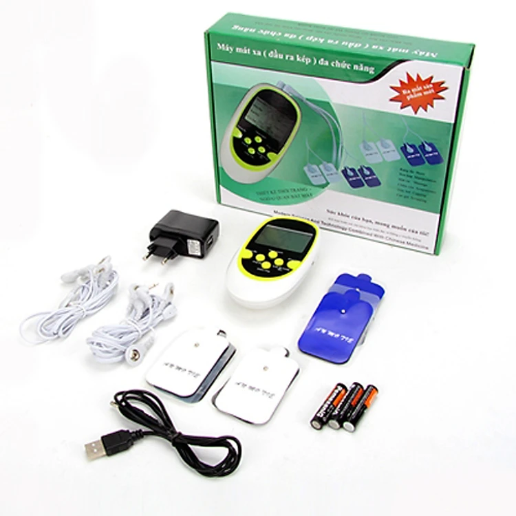 Bao gồm: máy, 2 dây điện cực, 8 miếng dán, pin 9V, Adaptor, sách hướng dẫn