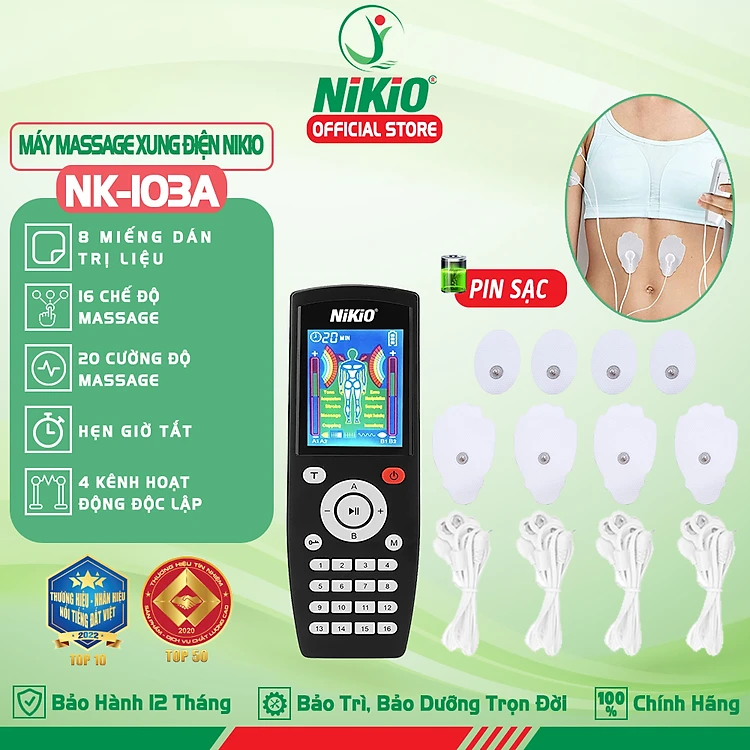 Máy massage xung điện Nikio NK-103A - 4 kênh, 8 miếng dán, 16 chế độ, 20 cường độ tùy chỉnh
