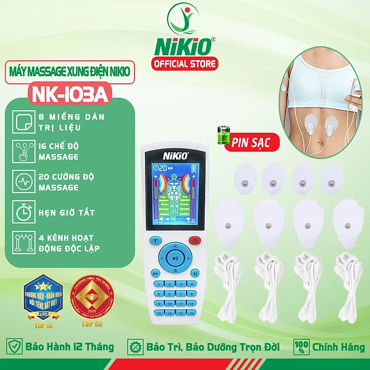 Máy massage xung điện Nikio NK-103A - 4 kênh, 8 miếng dán, 16 chế độ, 20 cường độ tùy chỉnh