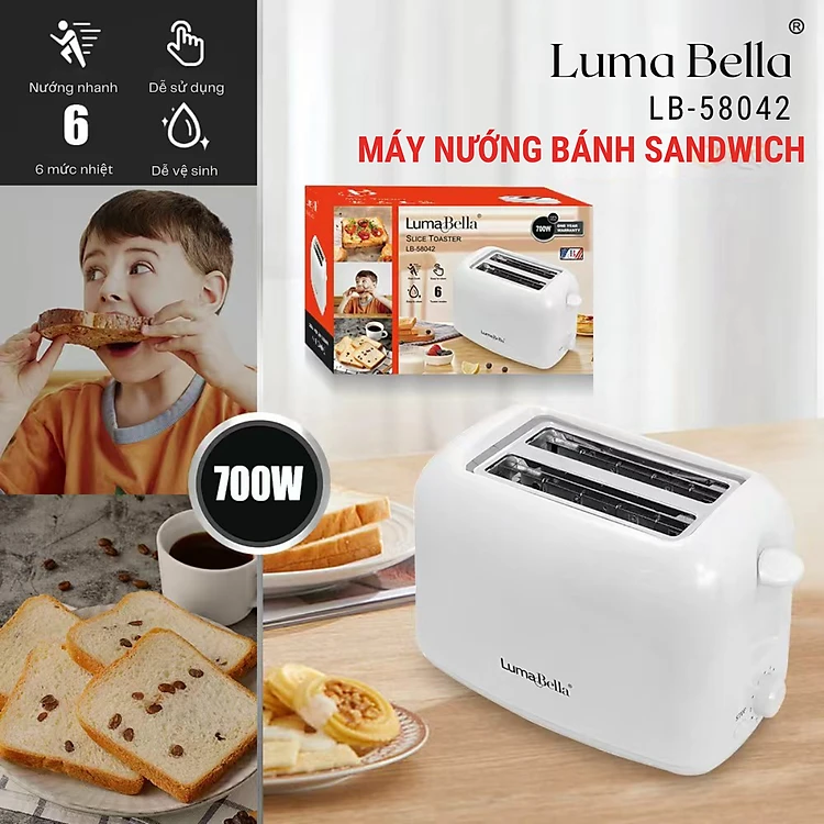 Máy nướng bánh mì sandwich Lumabella LB-58042 công suất cao 700W, 6 nấc nảy tự động làm bữa sáng tiện lợi - DELIYA HÀNG CHÍNH HÃNG