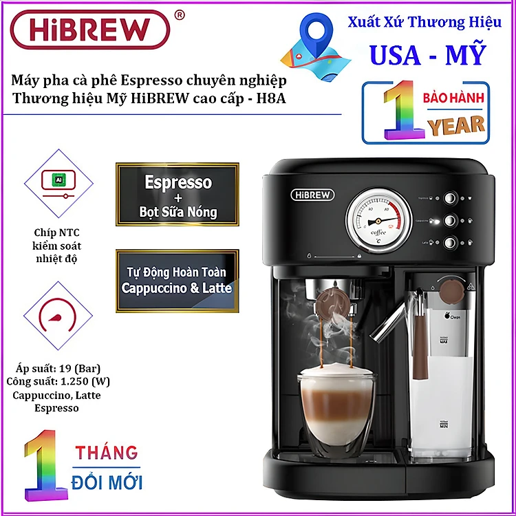 Máy pha cà phê Espresso chuyên nghiệp, thương hiệu Mỹ HiBREW cao cấp - H8A - HÀNG CHÍNH HÃNG