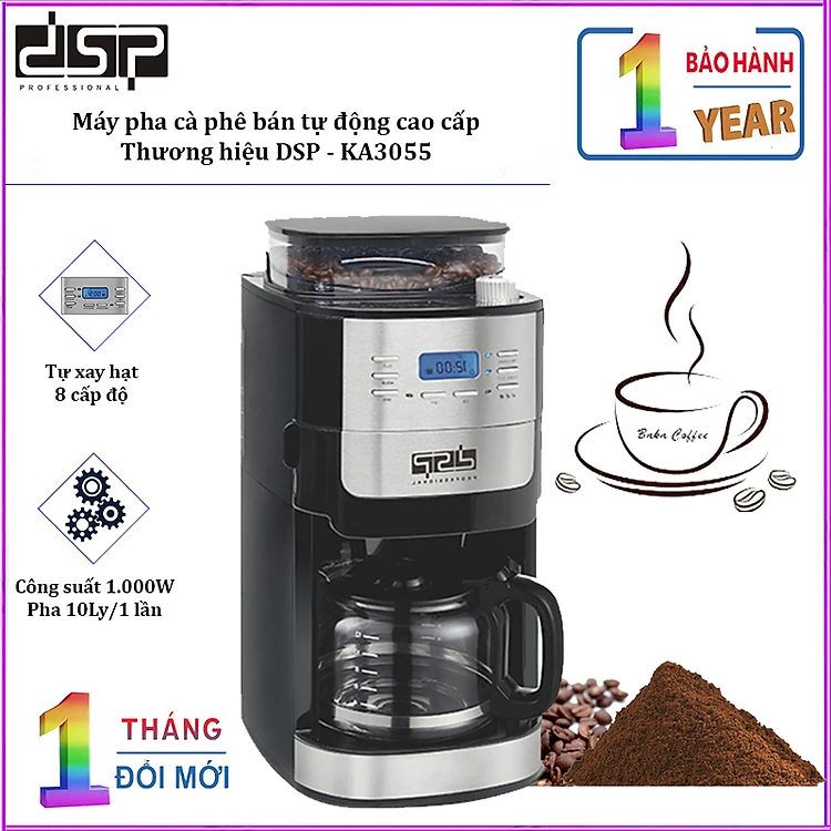 Máy pha cà phê hạt kết hợp xay sẵn bán tự động DSP KA3055 công suất 1000W, tích hợp chức năng hẹn giờ, chống nhỏ giọt khi ngưng máy- Hàng chính hãng