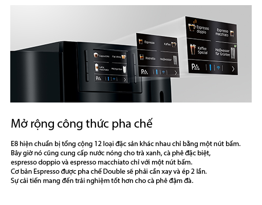 Với One-Touch Cappuccino dành cho các đặc sản theo xu hướng như latte macchiato, kèm với công nghệ P.E.P giúp tối ưu hóa thời gian chiết xuất và đảm bảo mùi thơm tốt nhất cho cà phê đặc biệt.