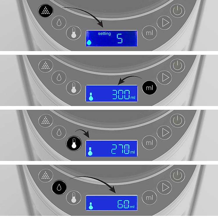 – Các mức pha sữa: 60ml, 90ml, 120ml, 150ml, 180ml, 210ml, 240ml, 270ml, 300ml.