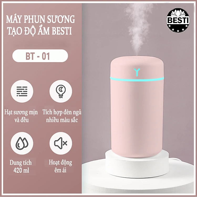Máy Phun Sương Besti BTY01 Cao Cấp - Tạo Ẩm Không Khí Và Giữ Ẩm Da 420ml - Thiết Kế Nhỏ Gọn, Không Gây Tiếng Ồn - Máy Tạo Ẩm Không Gian Thư Giãn Tích Hợp Đèn Ngủ RGB Nhiều Màu Để Bàn Tiện Lợi, Có Chế Độ Tự Ngắt Khi Hết Nước - Hàng Chính Hãng