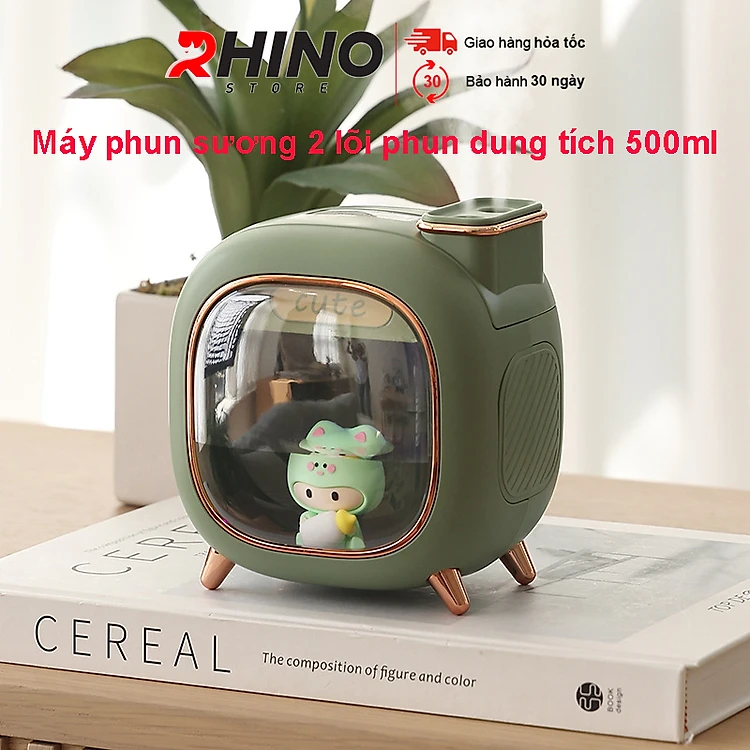 Máy phun sương, xông tinh dầu Rhino H809 500ml tạo ẩm, 2 đầu phun kèm đèn ngủ - Hàng chính hãng