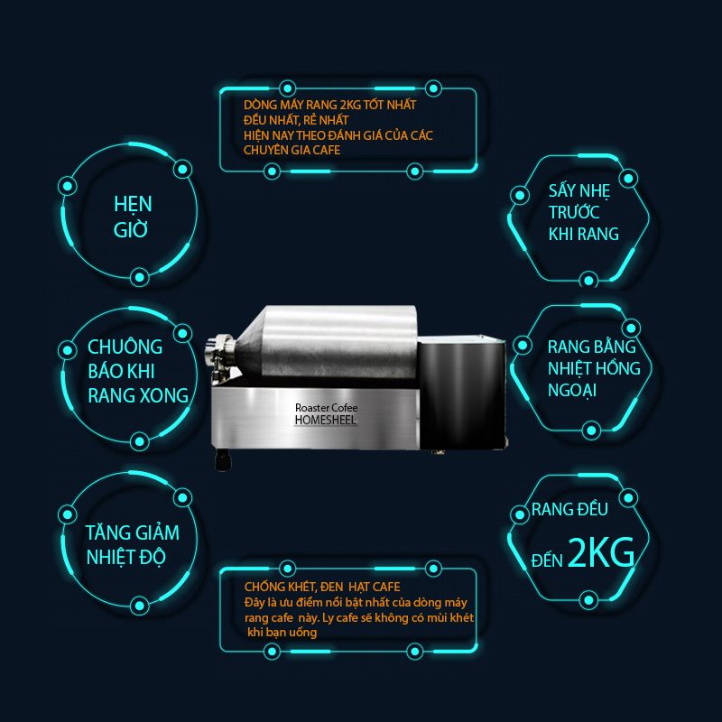• Rang đều, rang được nhiều hơn so với một số loại máy khác. Rang không bị khét và đều  là yếu tố cốt lõi tạo nên ly cà phê ngon và sạch. Với kích thước nhỏ gọn và không chiếm nhiều diện tích.