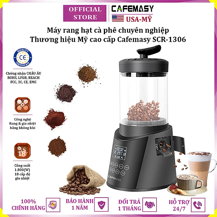 Rang cà phê là quá trình cấp nhiệt để biến hạt cà phê xanh (cà phê nhân chưa rang) trở thành hạt cà phê nâu đen mà bạn hay thấy. Hạt cà phê xanh vẫn có các chất acid, protein, nhưng không có hương vị. Quá trình cấp nhiệt sẽ thúc đẩy các phản ứng hóa học, đặc biệt là phản ứng của đường và các acid amin tạo ra mùi thơm. Hạt cà phê xanh sau khi rang bị mất hơi nước nên nhẹ hơn. Hạt cafe cũng nở ra nên có thể tích to hơn. Cà phê sau khi rang rất khó bảo quản trong thời gian dài. Do đó chúng tôi Giới thiệu máy rang hạt cà phê không khí dùng cho gia đình cao cấp Cafemasy SCR-1306