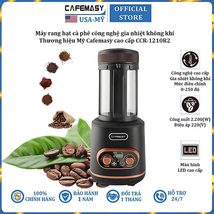 Rang cà phê là quá trình cấp nhiệt để biến hạt cà phê xanh (cà phê nhân chưa rang) trở thành hạt cà phê nâu đen mà bạn hay thấy. Hạt cà phê xanh vẫn có các chất acid, protein, nhưng không có hương vị. Quá trình cấp nhiệt sẽ thúc đẩy các phản ứng hóa học, đặc biệt là phản ứng của đường và các acid amin tạo ra mùi thơm. Hạt cà phê xanh sau khi rang bị mất hơi nước nên nhẹ hơn. Hạt cafe cũng nở ra nên có thể tích to hơn. Cà phê sau khi rang rất khó bảo quản trong thời gian dài. Do đó chúng tôi giới thiệu Máy rang hạt cà phê không khí dùng cho gia đình cao cấp Cafemasy CCR-1210R2