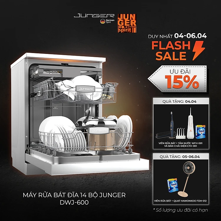 Máy rửa bát Junger DWJ-600 Dung tích 14 bộ Phím cảm ứng Hàng Chính Hãng Bảo Hành 24 Tháng