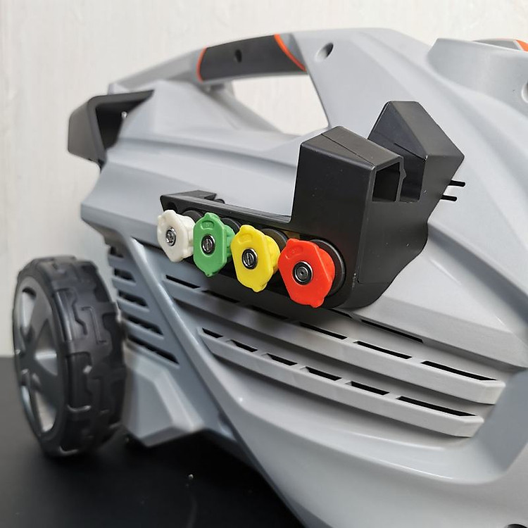 - Máy được sản xuất màu ghi và trên thân máy được thiết kế với tay cầm màu cam và đen, đó là một điểm nhấn độc đáo cho Máy rửa xe thêm phần tinh tế và bắt mắt.