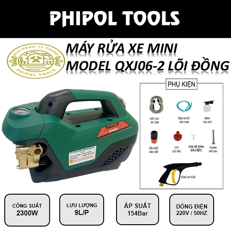 Máy rửa xe công suất 2300W PHIPOL TOOLS QXJ06.2 dây lõi đồng tặng kèm bộ phụ kiện - Hàng Chính Hãng