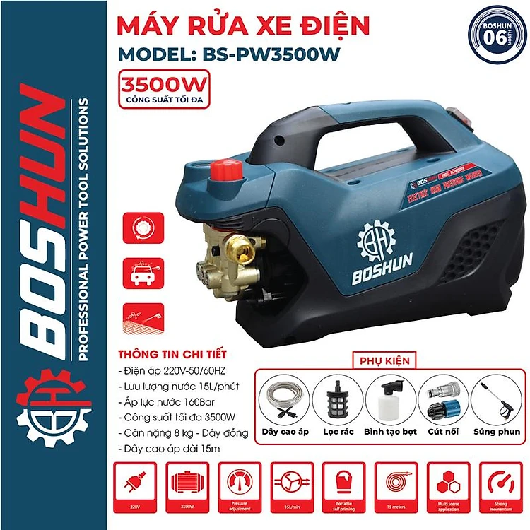 Máy Rửa Xe Chỉnh Áp BOSHUN BS-PW3500W, Công Suất 3500W, Có Chỉnh Áp, Dây Xịt Dài 15M