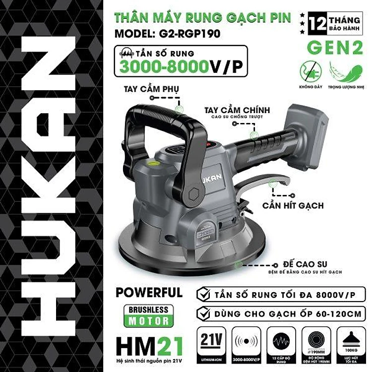 MÁY RUNG GẠCH PIN 190MM G2-RGP190 HUKAN -HÀNG CHÍNH HÃNG