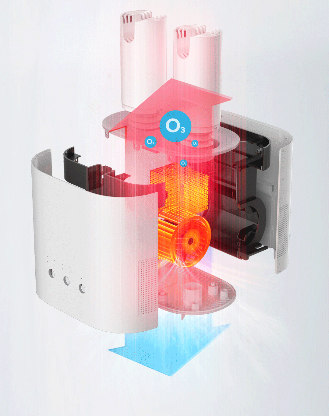 Luồng khí nóng 65ºC không đổi xuyên qua các lớp da trong giày, lúc này máy sấy sẽ tạo ra 1 lượng khí 03 thấm đều từng sợi trong giày để lập tức bắt lấy các yếu tố gây mùi và tế bào vi khuẩn trong không khí tiêu diệt 99.9% vi khuẩn Staphylococcus aureus phổ biến trong giày, candida albicans, chóng lấy đi độ ẩm và giữ cho giày khô ráo.