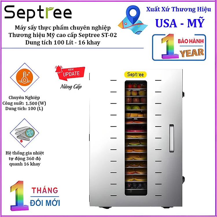 - Máy sấy thực phẩm 16 khay Septree, sử dụng hệ thống gia nhiệt vô cùng thông minh và tự động. Toàn bộ 16 khay được gia nhiệt đều 360 độ tự động hoàn toàn giúp dòng khí được gia nhiệt thổi và phân phối khí đều các mặt, tiếp cận trực tiếp từng khay thực phẩm từ đa hướng