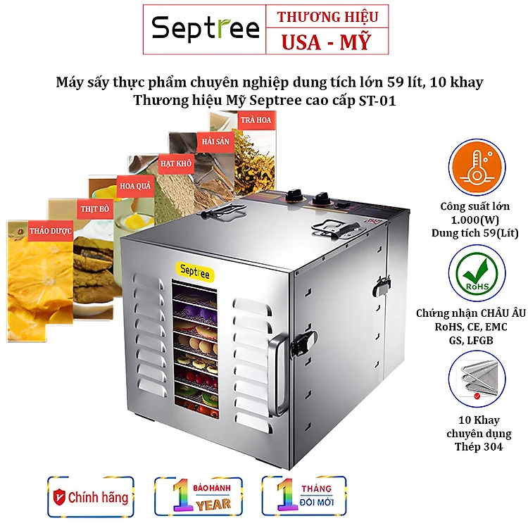 Máy sấy thực phẩm chuyên nghiệp dung tích lớn 59 lít, có tới 10 khay inox, Thương hiệu Mỹ Septree cao cấp ST-01 - HÀNG CHÍNH HÃNG, BẢO HÀNH 12 THÁNG