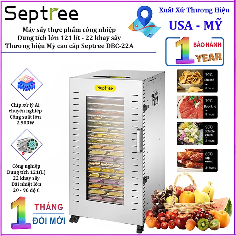 Máy sấy Septree 22 khay, có phạm vi nhiệt độ sấy vào khoản từ 20 độ C đến 90 độ C, có thể sử dụng để sấy khô, sấy dẻo hầu hết các loại nông sản, hoa quả, thực phẩm có kích thước phù hợp với công suất thiết kế của máy: