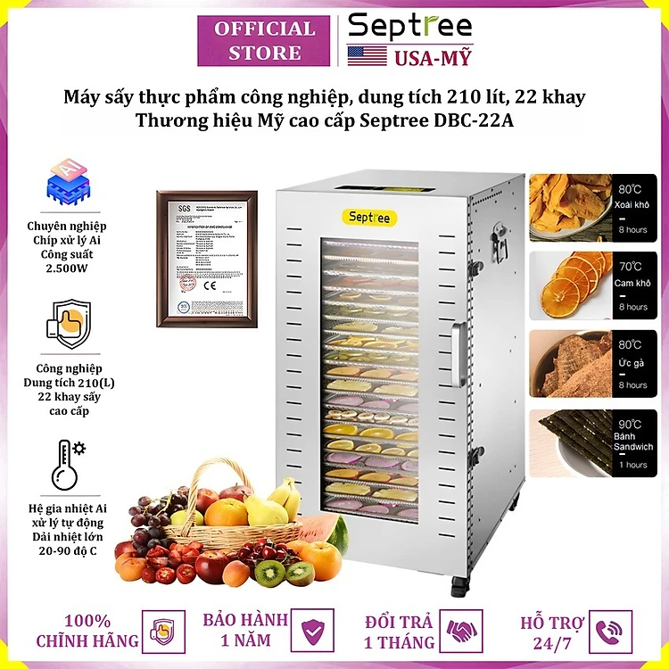 Máy sấy thực phẩm dung tích 210 lít, 22 khay thương hiệu Mỹ cao cấp Septree DBC-22A - Hàng Nhập Khẩu