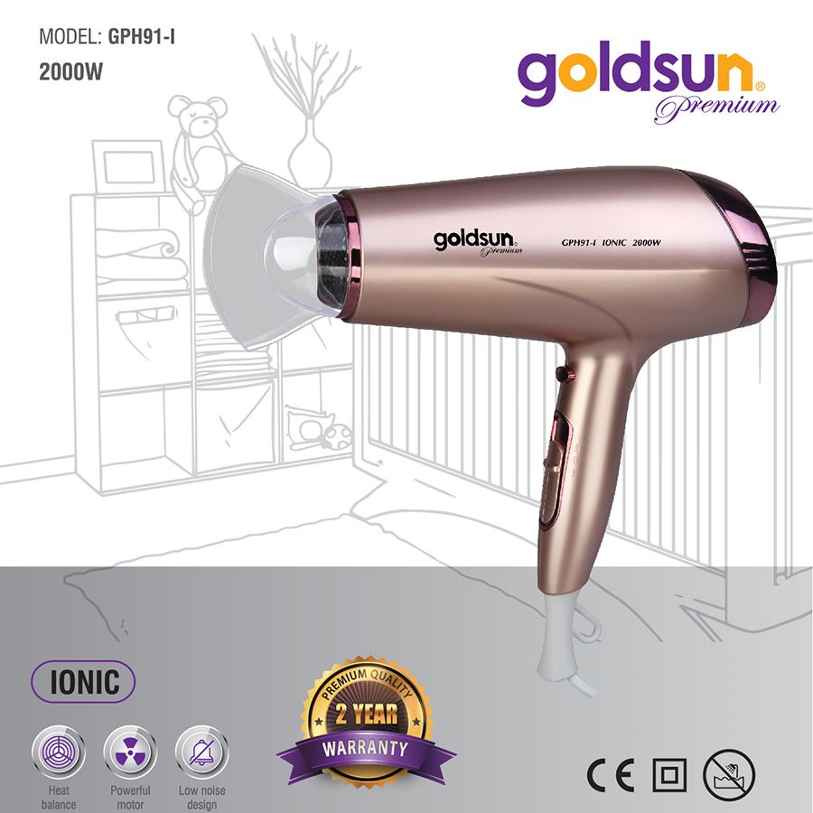 - Máy Sấy Tóc Ionic Goldsun Premium Gph91-I là công cụ hỗ trợ cho các bạn gái trong việc chăm sóc mái tóc của mình. Sản phẩm có vỏ bọc được làm từ chất liệu nhựa cứng cáp, màu sắc tinh tế, nút điều khiển được bố trí ở giữa tay cầm thuận tiện khi sử dụng.