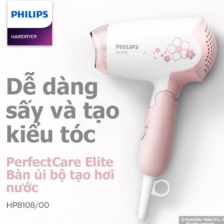 Máy sấy tóc mini gấp gọn Philips HP8108, công suất 1000W, an toàn bảo vệ tóc, bảo hành 2 năm|Hàng Chính Hãng