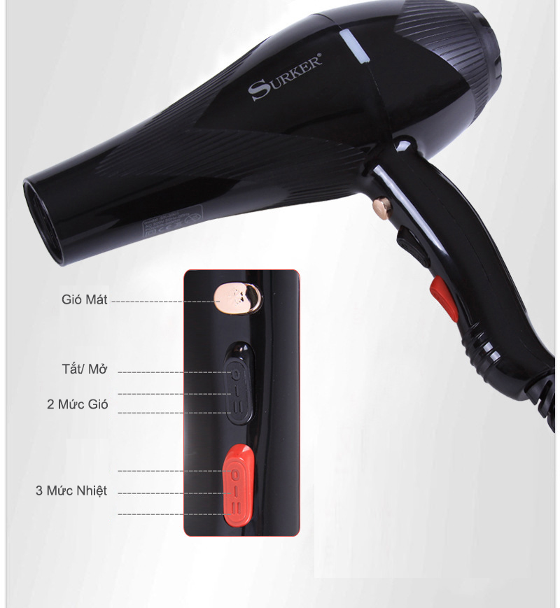 Surker SK-3901 sử dụng công chế độ sấy ion giúp đưa ion âm vào bên trong sợi tóc. Được tích điện âm, sợi tóc sẽ hấp thu nước và giữ lại độ ẩm cần thiết như được làm khô tự nhiên.