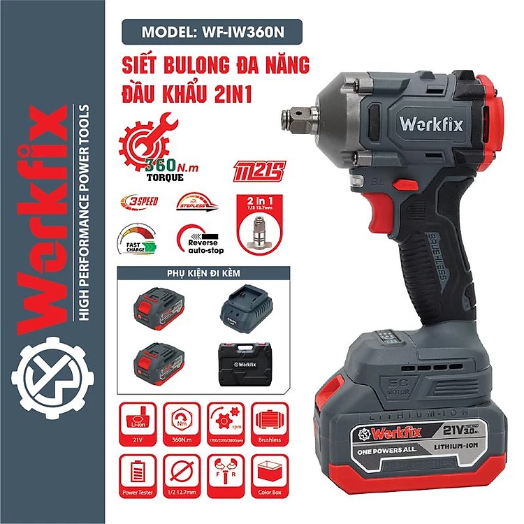 Máy Siết Bulong Workfix 360N- WF-IW360N - Đa Năng 2 Trong 1 - Lực Siết 360N.m - Động Cơ Từ Lõi Đồng - 2 Pin 21V/3Ah - Bảo hành chính hãg