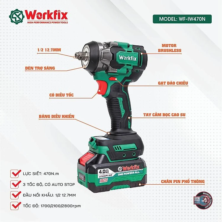 Máy Siết Bulong Workfix 470N.m - Đa Năng 2 In 1 - WF-IW470N - Motor Brushless - Chân Pin Phổ Thông 2 Pin 21V/4Ah - Bảo Hành Chính Hãg 6 thang