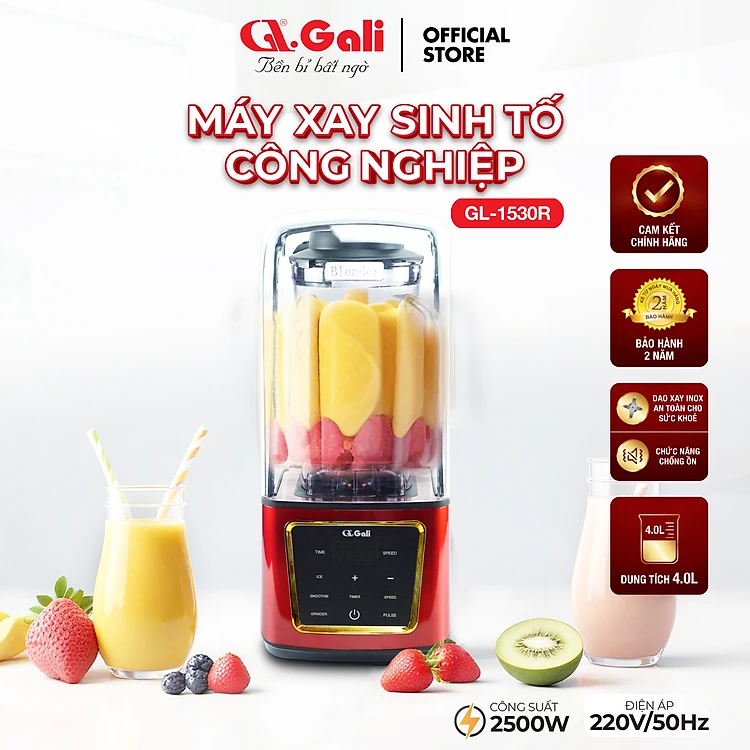 Máy Sinh Tố Công Nghiệp Gali GL-1530R Dung tích 4 Lít. Thiết kế chống ồn. Motor được quấn bằng đồng, Cối bằng nhựa PC siêu bền, Dao bằng thép không gỉ. Hàng chính hãng bảo hành 24 tháng