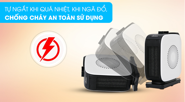 Sử dụng an toàn với thiết kế chống cháy tuyệt đối, tính năng tự ngắt điện khi quá nhiệt, khi bị đổ, ngã. Bên hông máy còn có thiết kế tay cầm dễ cầm nắm, di chuyển một cách dễ dàng.
