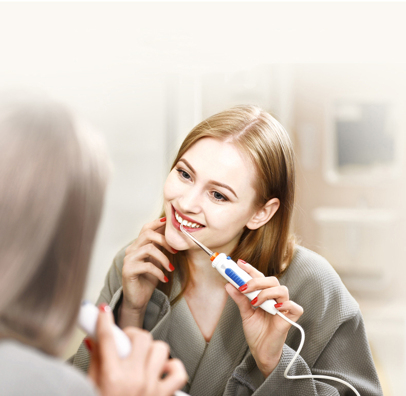 Tay cầm có nút gạt điều chỉnh 6 tốc độ từ thấp lên cao bao gồm chế độ tạm dừng. Trên thân máy có trang bị công tắc bật để tránh hiện tượng phun nước đột ngột. Đầu tăm gắn chắc chắn an toàn và có thể xoay 360 độ theo các hướng của hàm răng và tư thế cầm máy. Đầu tăm chỉ có thể tháo ra bằng cách ấn nút kéo ra ngoài.