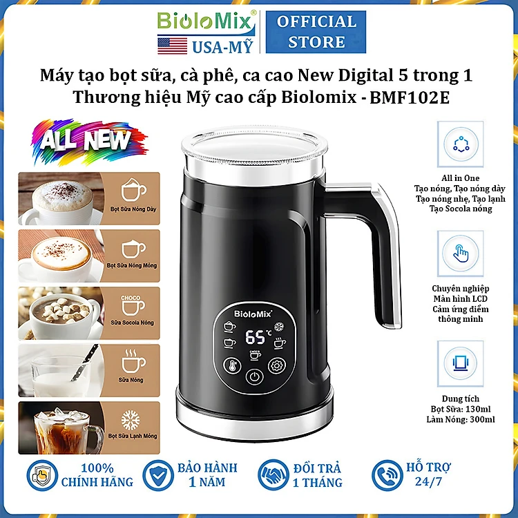 Máy tạo bọt sữa, cà phê, ca cao New Digital 5 trong 1 chuyên nghiệp thương hiệu Mỹ Biolomix BMF102E - Hàng chính hãng (BẢO HÀNH 1 NĂM)