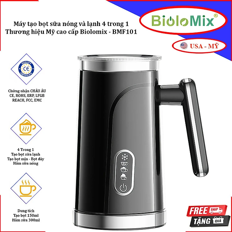 Máy tạo bọt sữa nóng và lạnh 4 trong 1. Thương hiệu Mỹ cao cấp Biolomix - BMF101. Hàng nhập khẩu