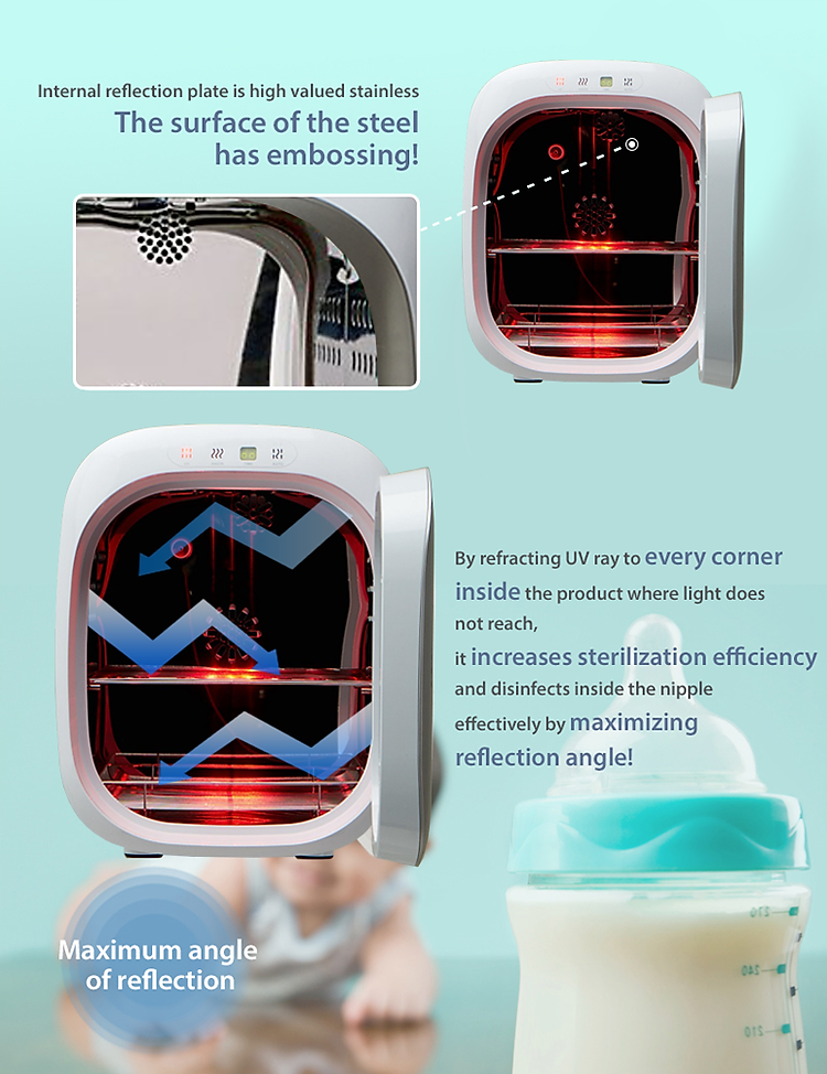 Bình sữa, núm ti, phụ kiện hút sữa và các đồ dùng khác của mẹ và bé sẽ được tiệt trùng và chống nhiểm khuẩn một cách tuyệt đối.