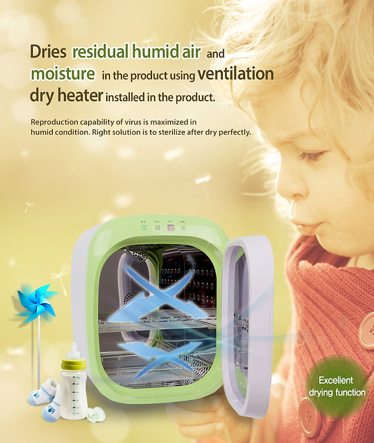 Đồ dùng cho bé được tiệt trùng bằng Máy tiệt trùng sấy khô khử mùi bằng tia UV Ecomom.