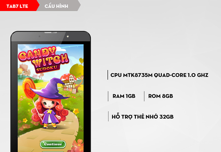 Máy trang bị vi xử lý MTK8735M, 4 nhân 1GHz giúp máy chạy ứng dụng mượt mà, xử lý các tác vụ hiệu quả. Ngoài ra bộ nhớ RAM 1GB, ROM 8GB và hỗ trợ khe cắm thẻ nhớ ngoài lên đến 32GB cho thiết bị hoạt động lâu dài, mở rộng thêm không gian lưu trữ thông tin. Máy hoạt động trên nền tảng hệ điều hành Android 7.0 để bạn dễ dàng thao tác mọi tính năng.