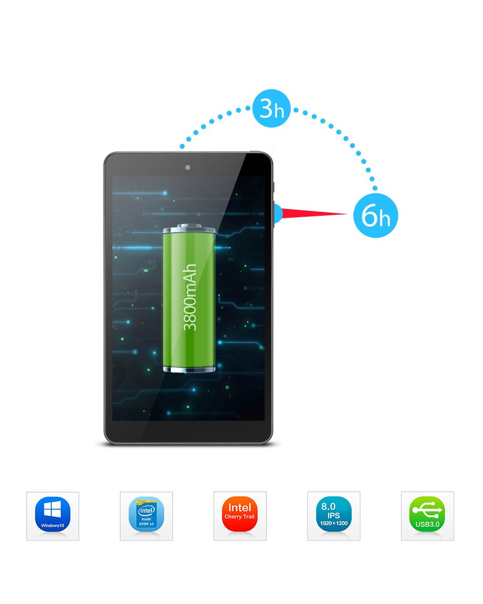 Máy tính bảng tablet Windows 10 Pipo W2S 8 inch tích hợp các thiết bị khác của bạn vừa là chiếc máy tính bảng và có thể kết nối với Smart TV hay điện thoại di động trong khi vừa làm việc và chơi. Dung lượng pin 3800mAH/ 3.7V có thể đáp ứng được mọi nhu cầu hoạt động của bạn.