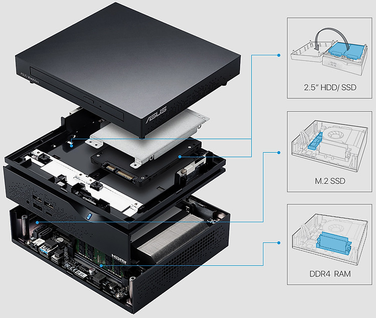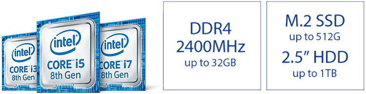 Được trang bị các bộ vi xử lý mới nhất từ Intel Pentium Gold đến các dòng Core i3, i5, i7, ASUS VivoMini VC66-C cho hiệu suất nhanh hơn 30% so với các bộ xử lý thế hệ trước để xử lý mượt các tác vụ tính toán chuyên sâu. Sự hỗ trợ lên tới 32GB bộ nhớ DDR4 2400Mhz nhanh để nâng cao hiệu suất nhằm cải thiện hiệu suất xử lý đa tác vụ cùng thiết kế bộ lưu trữ kép với một ổ cứng M.2 SSD hoặc hai ổ cứng HDD 2,5 inch tạo ra sự kết hợp hoàn hảo giữa tốc độ truyền dữ liệu nhanh và dung lượng lưu trữ cao.
