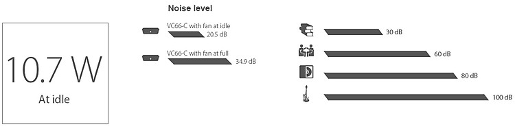 VivoMini VC66-C cho hiệu suất năng lượng vượt trội - chỉ tiêu tốn 10,7W khi chạy ở chế độ không tải. Điều này có nghĩa là bạn có thể bật VC66-C qua đêm để tải các bản cập nhật phần mềm hoặc tập tin sao lưu mà không làm tăng đáng kể hóa đơn tiền điện. VivoMini hoạt động tĩnh lặng như một thư viện — chỉ tạo ra mức ồn 20,5dB ở chế độ không tải.
