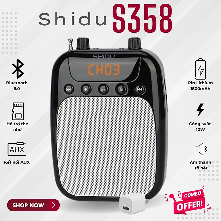 Máy trợ giảng Shidu SD-S358 - Giảng dạy hiệu quả, âm thanh sống động | Bluetooth 5.0, Thẻ nhớ, Công suất 10W, Pin 15h, FM, Ghi âm | Micro không dây, kết nối đa dạng | Thiết kế nhỏ gọn, bền bỉ | Phù hợp giảng dạy, hội họp, du lịch | Hàng Nhập Khẩu