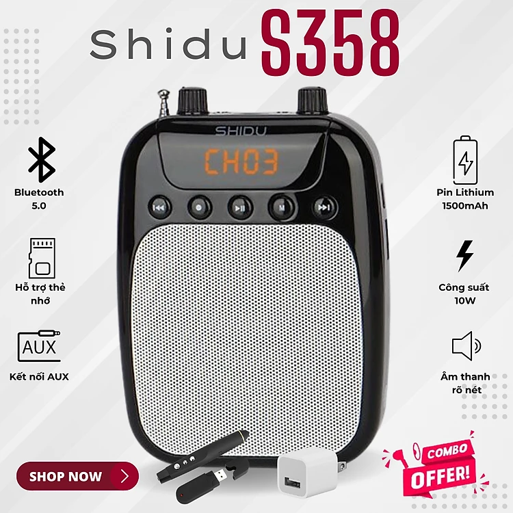 Máy trợ giảng Shidu SD-S358 - Giảng dạy hiệu quả, âm thanh sống động | Bluetooth 5.0, Thẻ nhớ, Công suất 10W, Pin 15h, FM, Ghi âm | Micro không dây, kết nối đa dạng | Thiết kế nhỏ gọn, bền bỉ | Phù hợp giảng dạy, hội họp, du lịch | Hàng Nhập Khẩu