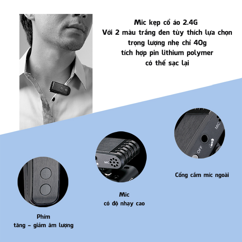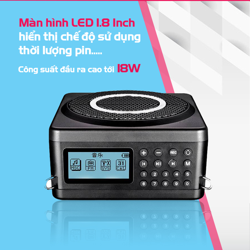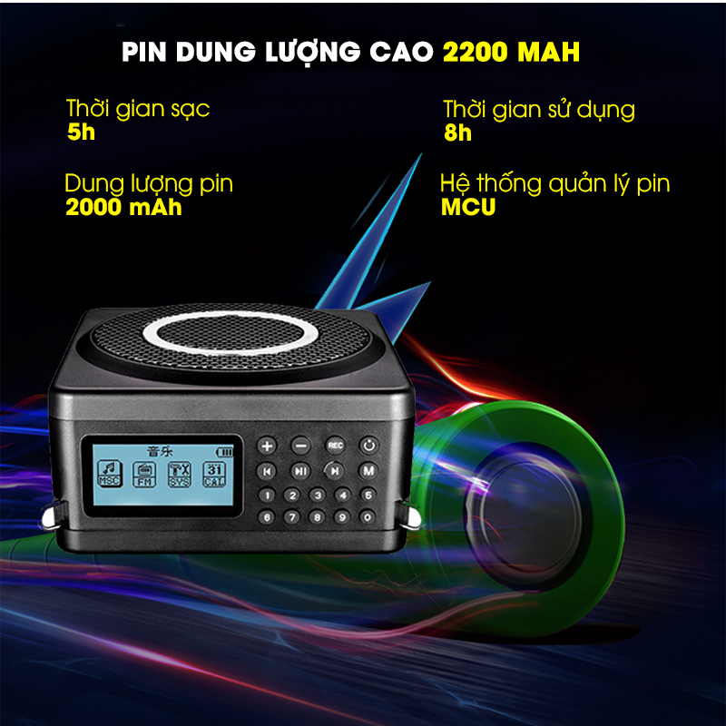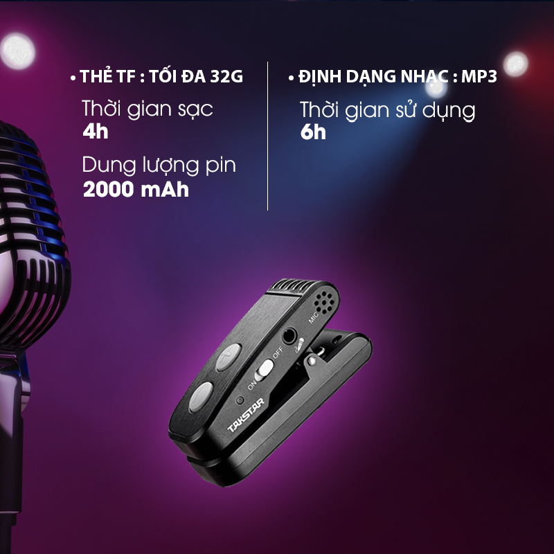 • Tần số sóng mang: Băng tần phổ tần 2.4G • Chế độ hoạt động: ID kỹ thuật số thích ứng • Công suất RF: ≥10MW • Khoảng cách hiệu quả: khoảng cách trong nhà: 8m • Đáp ứng tần số: 80Hz-12kHz • Công suất đầu ra tối đa: 2 X 9W • Công suất đầu ra: 2 X 5W • Trở kháng loa: 4Ω • Thẻ TF: tối đa 32G • Định dạng phương tiện: Mp3 • Điện áp hoạt động của máy thu: 7.4V • Thông số pin của máy thu: Pin lithium-ion 7.4V / 2000mAh • Điện áp sạc của máy thu: DC 10.6 V 450--2000mA • Thời gian sạc của máy thu: khoảng 5 giờ • Thời gian sử dụng máy thu: ≥6 giờ • Điện áp hoạt động của máy phát: 3.7V • Thông số pin máy phát: Pin lithium polymer 3.7V / 350mAh • Điện áp sạc máy phát : DC 5V / 100--2000mA • Thời gian sạc máy phát: khoảng 4 giờ • Thời gian sử dụng máy phát: ≥5 giờ • Trọng lượng máy chủ loa: 410g
