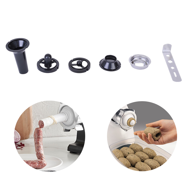 2.2: Máy xay thịt, máy đùn làm xúc xích: Giờ đây với bộ sản phẩm máy làm bếp đa năng gia đình bạn không còn phải lo lắng về vấn đề vệ sinh an toàn thực phẩm khi lựa chọn cách xay thịt ngoài hàng như trước đây nữa. Bạn hoàn toàn có thể chủ động được, sản phẩm này sẽ giúp bạn có những mẻ thịt xay nhuyễn, nhỏ, mịn và chỉ trong tích tắc mà thôi.
