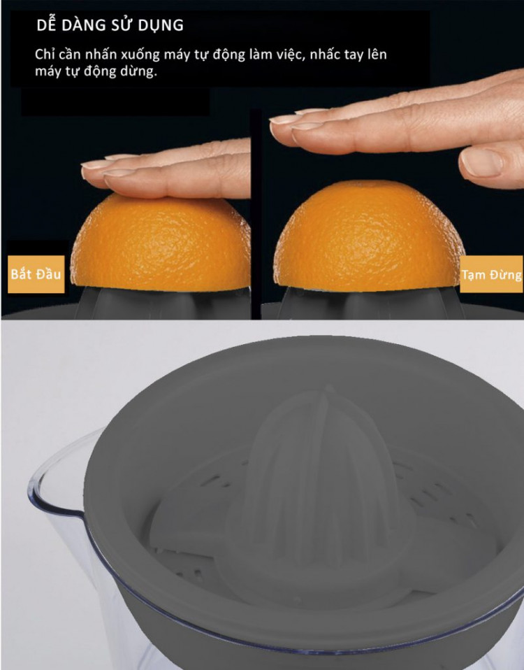 Thao tác với Máy vắt cam Mishio MK-174 rất đơn giản chỉ bằng thao tác ấn nhẹ xuống núm vặn, máy sẽ tự động xoay vắt kiệt lượng nước trong quả cam, chanh…và khi bạn thả tay ra máy lập tức dừng lại, chức năng này còn rất an toàn cho các gia đình có trẻ nhỏ, sẽ không gây nguy hiểm cho trẻ.