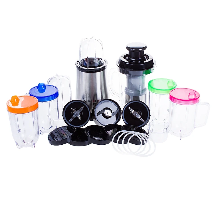 Máy xay ép đa năng Shimono SKP 1009 gồm 1 cối xay lớn, 2 cối xay nhỏ, 4 ly đựng, 3 lưỡi dao, 1 ống ép thực phẩm đáp ứng mọi nhu cầu xay, ép, trộn, hay chế biến nhiều loại thực phẩm khác của bạn. Sản phẩm được thiết kế nhỏ gọn, vỏ ngoài được làm bằng Platium sáng bóng, sang trọng và bền chắc, 3 lưỡi dao được làm bằng thép không gỉ, 2 cốc có thể nấu trong lò vi sóng vừa tiện lợi vừa an toàn cho sức khỏe. Bạn có thể pha chế các loại rượu, cà phê, các loại nước ép trái cây, sinh tố hay đánh kem, đánh trứng, nhào bột, xay/băm nhuyễn các loại gia vị thảo mộc, hay xay sữa đậu nành... thật dễ dàng và nhanh chóng. Là một máy xay ép đa năng nhỏ gọn chắc chắn Shimono SKP 1009 sẽ hấp dẫn các bà nội trợ không chỉ bởi chất lượng, tính tiện dụng và còn cả tính thẩm mỹ cao.