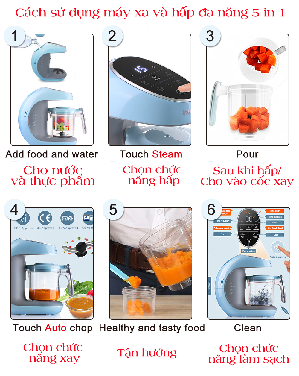 Mỗi bà mẹ hoặc cha yêu thích làm sạch tự động. Chỉ cần nhấn một nút, và máy sẽ làm phần còn lại. Cốc và lưỡi dao là máy rửa chén an toàn, cho phép bạn nấu ăn với hơi nước sạch, mọi lúc.
